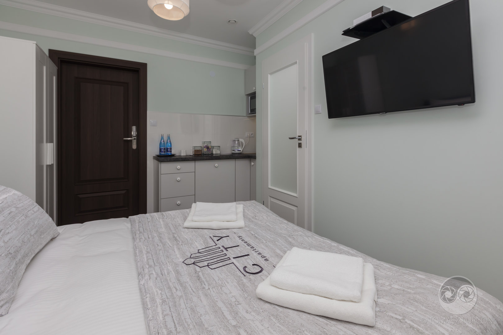 Apartament typu studio dla dwóch osób. Duże podwójne łóżko z możliwością rozdzielenia. W pełni wyposażony, posiada wszystkie niezbędne rzeczy: zestaw ręczników, kosmetyków, kawa i herbata, mleko oraz płatki śniadaniowe. Apartament posiada prywatną łazienk