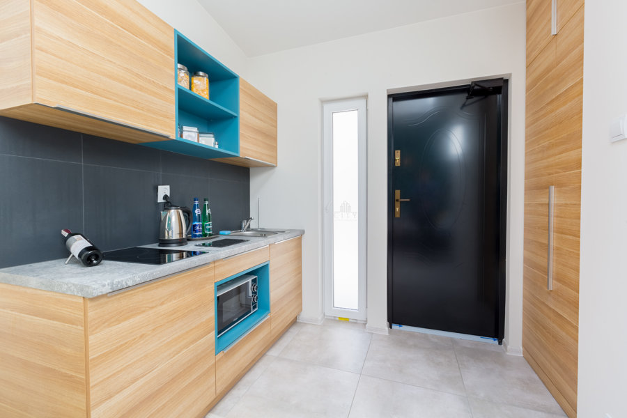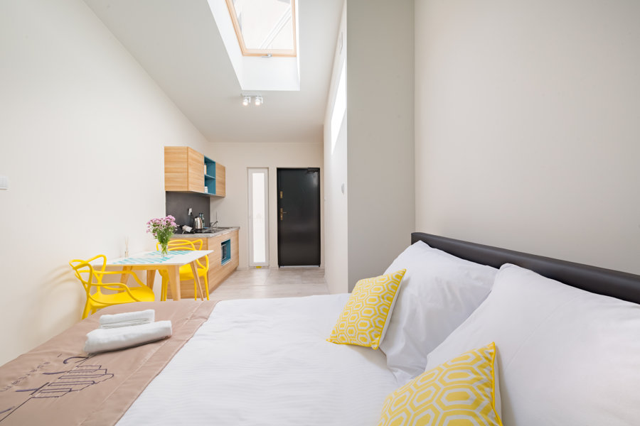 Apartament typu studio dla dwóch osób. Duże podwójne łóżko z możliwością rozdzielenia. W pełni wyposażony, posiada wszystkie niezbędne rzeczy: zestaw ręczników, kosmetyków, kawa i herbata, mleko oraz płatki śniadaniowe. Apartament posiada prywatną łazienk