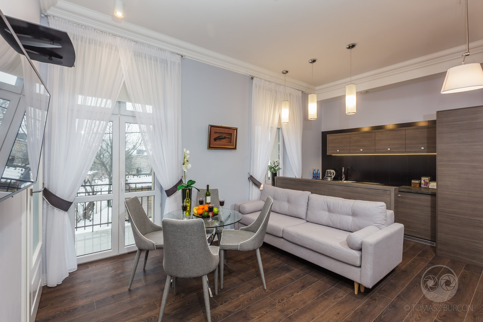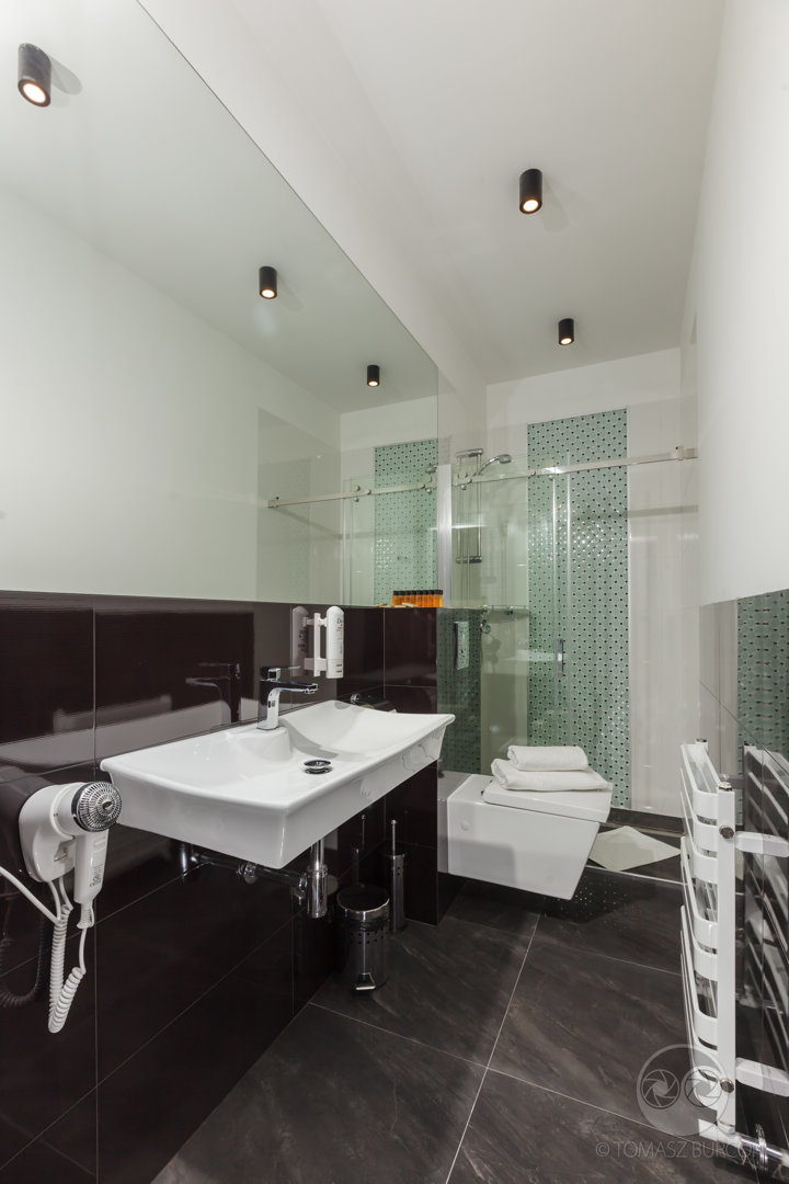 Książęta w średniowiecznej Polsce uwielbiali bogate dodatki, zdobione żyrandole, wysoki połysk i dużo, dużo miejsca w odwiedzanych wnętrzach. Przedstawiany apartament z pewnością przypadłby do gustu nawet gościom z najbardziej błękitną krwią. Duży salon z praktycznie niewidocznym aneksem kuchennym wręcz zaprasza by rozgościć się na niesamowicie wygodnej sofie w stylu retro. Łazienka zaskakuje ciepłem kolorów – a ogromne łoże w sypialni to prawdziwy hit. Apartament Książęcy to jeden z naszych flagowych lokali – zapraszamy!